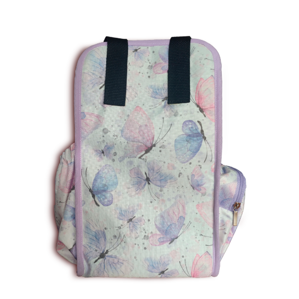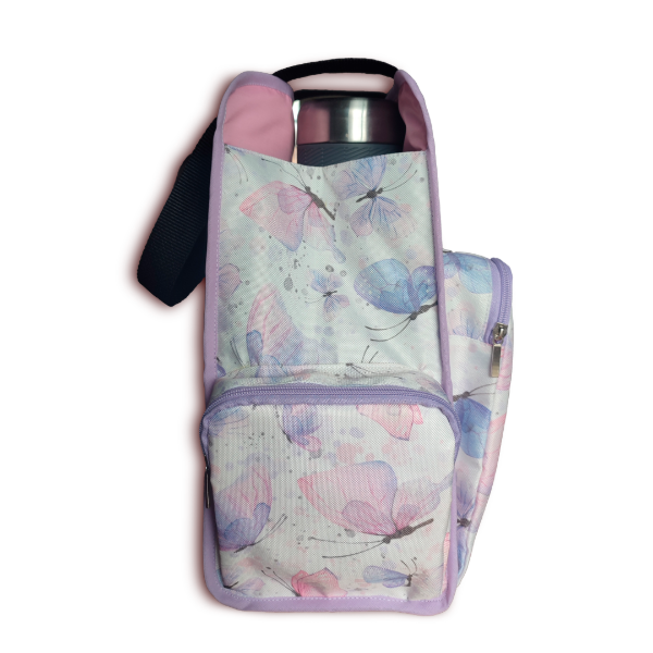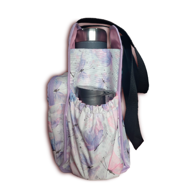 Cuenta con un amplio compartimento principal, 1 bolsillo lateral elástico para botellita, y un bolsillo frontal con cierre para guardar yerba, azúcar o accesorios.